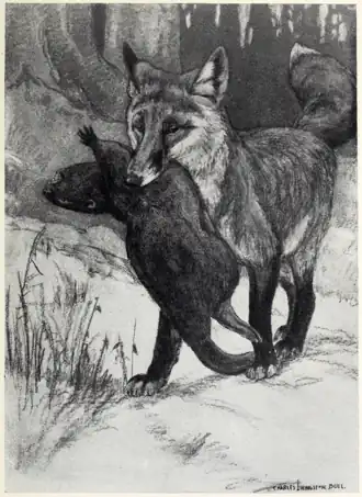 Finally, as a last resort, Redcoat searched the home burrow, in all its branches, to see if in any way he had overlooked his family. Then gradually it came over Redcoat that his kin had gone forever, and he ceased to look for them, but he did put in several moonlight nights, sitting upon a cliff which overlooked the great meadows, looking and wondering. Occasionally he would lift his pointed nose to the moon and howl, a long thin howl, which was the very epitome of grief. But finally even his grief was forgotten in the struggle to get food and to keep his own brush safe from the men who were after him so persistently.