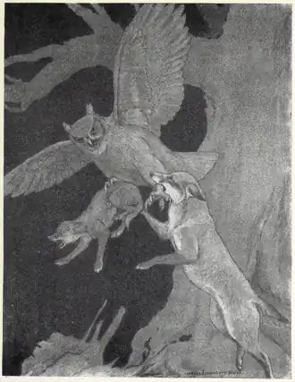 It was at such a time as this, when everything was ripe and ready, that the Red Flower went mad, and great was the excitement among both men and the wild creatures. It started its mad career on the Holcome farm down on the edge of the meadow. No one ever knew how it happened. Perhaps it was a cigarette butt or a partly extinguished match, but anyhow the mischief was done. One evening from his lookout Redcoat saw the Red Flower leap up in half a dozen places. After a short time he saw men striking at it with spruce bows. They were running hither and yon and seemed very much excited. They would beat the Red Flower down to earth in one spot only to have it leap up in another. As soon as they went to the new fire it would flame up in the spot they had just left. The night wind would catch it even as it did the dead leaves and it would go racing through the grass at a frightful pace. Soon the men brought teams and plowed furrows trying to stop it. Then they started other fires and tried to make them run towards the one that was racing to the mountain, but the Red Flower swept on, fanned by the night wind, for it had gone mad and it was beyond the power of man to stop it. Soon it mounted to the lower slopes of the mountain and began creeping up the trunks of the trees. Up one tall pine it shot, twisting and writhing, and finally leaped fifty feet into the air, even lighting the ledge where Redcoat paced to and fro nervously. He could now hear the Red Flower roaring in its madness, and the smoke from the great conflagration choked him. Occasionally he coughed and sneezed. Frantically the men worked, plowing furrows, felling trees, and even using dynamite, but they could not stay the onward rush of the Red Flower. All that night Redcoat watched, and the flames crept higher and higher up the mountainside and came closer and closer to the den in the spruces. Finally the smoke became so thick that Redcoat could no longer watch this fascinating but terrible sight, so he fled into the spruces and marshaled his little family in preparation for moving them to safety.