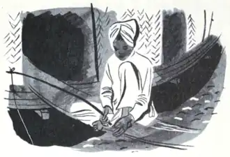 Fishing was good today. Rhamon gave his pole a jerk, and up came a little silvery fish, twisting and wiggling and glittering in the sunlight. In went the hook again and up came another fish. And then another! Rhamon grew excited, for he had never known the fish to bite so fast. It wouldn't be long, he thought, before he had a good pailful all ready for supper.