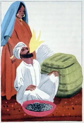 At this moment Mohammed jumped into the basket with both feet and stamped about to show there couldn't be anybody inside. Where was his wife? Just to be sure she wasn't there he got out, and taking up a long sharp sword, plunged it into the basket, this way and that, in and out, again and again.