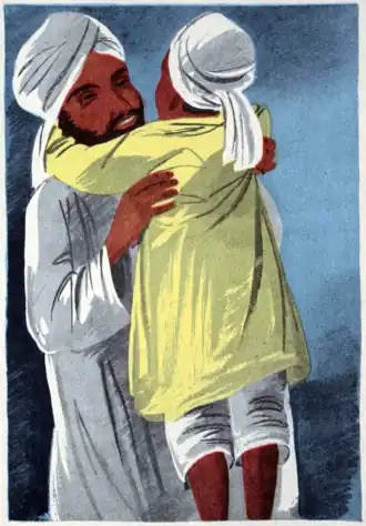 When he finally reached Srinagar and jumped down from the mail truck he saw the tall, white-robed figure of his father, waiting to meet him. Subro picked Rhamon up off his feet and gave him a great hug, then set him down again, saying over and over again, "Allah be praised! Allah be praised!"