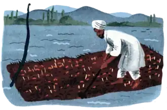 This morning Subro was planting cucumbers and melons in the garden. As soon as Rhamon had finished his breakfast, he ran out to help his father before the sun grew hot.
