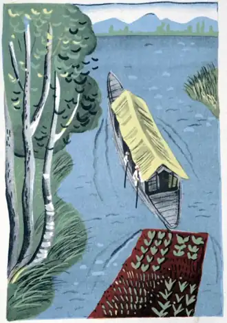 After a long time of poling like this the boat would be out in the big Dal Lake. Then Subro would always say, "Be careful, my son. The water here is very deep in places." And Rhamon would laugh. He would not fall in!
