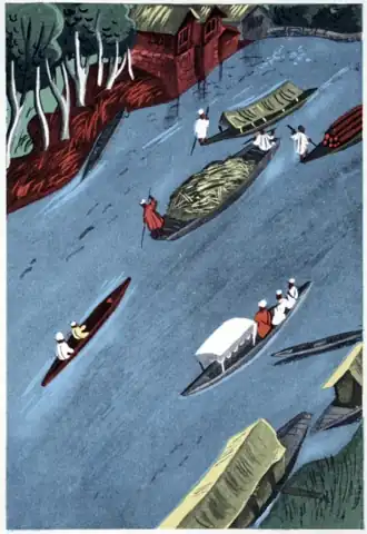 On their way down the river they passed boats of every description. There were shikaras like their own, skimming swiftly over the water, merchant boats, dugouts loaded with vegetables, slow-gliding grain barges, and some being poled along by a man or woman who stood balancing far out on the tip.