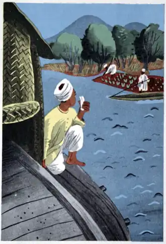 Late the next afternoon Rhamon was sitting on the narrow walk that ran around the outside of the houseboat. He was feeling happy, for his mother had just given him a freshly cooked chuppati wrapped about a bit of meat. As he munched it he dabbled his toes in the water and listened to the distant chiming of a temple bell. A mist hung over the river and the sun had almost set.