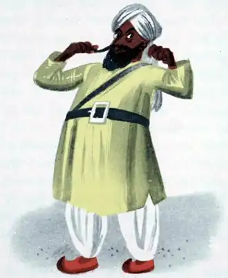The big Chief of Police twirled his fierce black moustache, and rubbed his nose. Then he called loudly for two of his men. Rhamon shivered at the sound of his voice. It seemed to come rumbling up from the soles of his big red slippers. Settling his huge turban farther on his head, the Chief took Rhamon's hand and started off with long strides. Rhamon could hardly keep step with him, but he felt very proud. Was he not walking down the streets of the city with the Chief of Police? Everyone made way for them and salaamed, touching his hands to his forehead and bowing low.