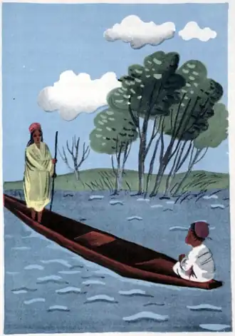the others joined him. Rhamon sang too, his voice rising clear and sweet above the men's deeper ones. Soon the night air was throbbing with the music. Then with his hands Subro began to beat the rhythm of the song on the side of the boat. Another boatman drummed on his paddle laid across his knees.