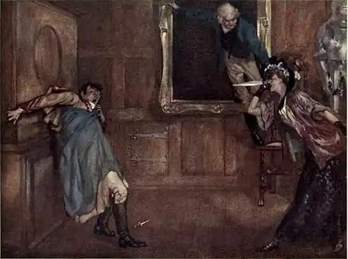 Rose. Nay, let me plead with him. [To Robin.] Sir Ruthven, have pity. In my book of etiquette the case of a maiden about to be wedded to one who unexpectedly turns out to be a baronet with a curse on him, is not considered. Time was when you loved me madly. Prove that this was no selfish love by according your consent to my marriage with one who, if he be not yourself, is the next best thing—your dearest friend!