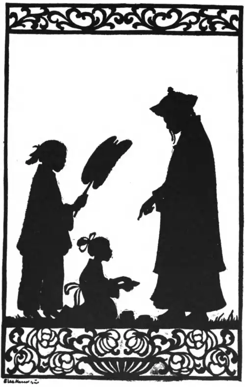 A trifle relieved, King Yang Lang passed into the garden. Beside the river bank he found his daughter, the Princess Chin Uor, or Princess Many Dimples—for that is the meaning of Chin Uor. Nurses standing near kept watch upon wheelbarrows spilling over with golden dolls. But Chin Uor had no thought for such toys. Her royal hands shaped the tastiest of mud pies. Very pretty pies they were—made of white clay.