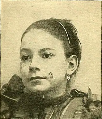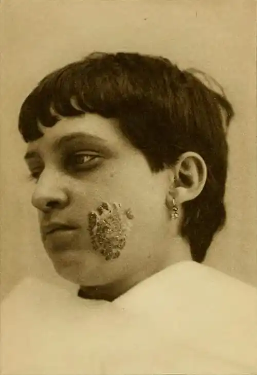 The nodules of lupus, when well developed, have a characteristic translucent, jelly-like appearance, and, though feeling firm and resilient to the touch, are much softer than the normal cutaneous tissue. In an advanced stage the nodules and patches of lupus become somewhat scaly and not infrequently soften and ulcerate. In chronic cases seen in adult life the disease is often found to have spread over the greater portion of the face, producing a marked ectropion and a partial disappearance of the nose and ears. Such an extensive development of the disease is rarely if ever observed in childhood. Although the face is the most common site of lupus, the trunk and extremities may also be affected, either independently or with the face.