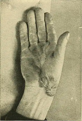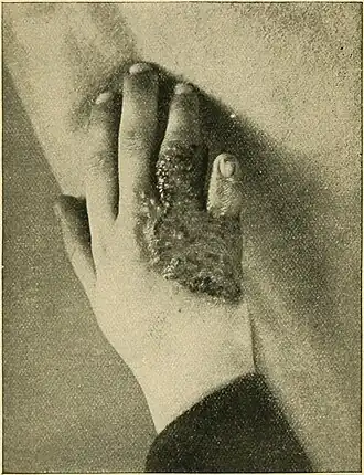 Another tuberculide, or affection in which the bacillus tuberculosis is invariably present, is often met with in childhood as well as in adult life, and is known as tuberculosis verrucosa or lupus verrucosus. This consists of dry, warty, or papillomatous patches (Fig. 40), which may develop upon the back of the hand, especially over the knuckles, the wrist, the popliteal spaces, and other portions of the body, and is commonly regarded as the result of local infection. The development of the disease is slow. Ulceration rarely occurs, but the centre of the patch may undergo a spontaneous cure, leaving cicatricial tissue.