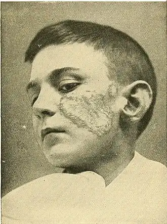 Lupus vulgaris is an affection which is often seen in childhood, and which, indeed, begins in most cases before the age of puberty. It usually appears in the form of one or more dull red papules upon the cheek or elsewhere. These slowly increase in number and tend to coalesce (Fig. 30). Frequently the older or central lesions disappear by interstitial absorption and an irregular ring is formed (Fig. 37), or an infiltrated patch with one or two outlying nodules (see plate). Upon the neck the disease often assumes a serpiginous form, spreading at the margin and enclosing a cicatricial area, dotted, perhaps, by a few recently developed nodules (Fig. 38). This form of the disease may have a somewhat acute character, and, though spreading slowly, may increase in extent much more rapidly than does the nodular form seen upon the cheeks.
