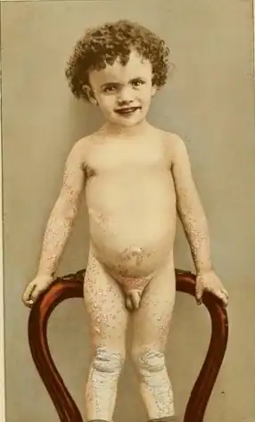 The papular syphilide often assumes a squamous form and presents for a time a strong resemblance to psoriasis. Fortunately it is rarely met with in childhood, but at any age it differs from psoriasis in one respect. While in the latter affection the infiltration of the skin is slight and the accumulation of scales a prominent feature, in the papular syphilide the infiltration of the skin is considerable and the scaling is comparatively slight.