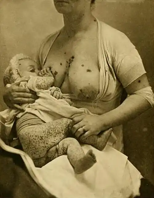 Syphilis hereditaria.—When syphilis is transmitted from one generation to another it may result in the death of the foetus in utero, or in the development of an infantile eruption which either is present at birth or appears shortly after. In most cases it manifests itself within three months, and always during the first year. The eruption may be erythematous and appear as a general roseola, similar to the earliest eruption of acquired syphilis, or in the form of dull-red patches on the trunk and upon the palms and soles, which present a dry, scaly appearance quite characteristic of the inherited disease. About the mouth the skin is often dry and fissured, and on the buttocks the patches are apt to become raw and even ulcerated at various points. In some cases the eruption assumes a papular character (see plate), and numerous yellowish-red and slightly scaly discs are seen upon the buttocks, thighs, and face, and occasionally over the greater portion of the body. In rare instances the papules are small, flattened, and shining, and present a strong resemblance to lichen planus. Pustular lesions of an ecthymatous character are sometimes present, especially in infants who are ill-nourished and poorly cared for. Bullous lesions are not infrequently seen upon the palms and soles and other portions of the body, and in fact are much more common than in the acquired disease of adult life.