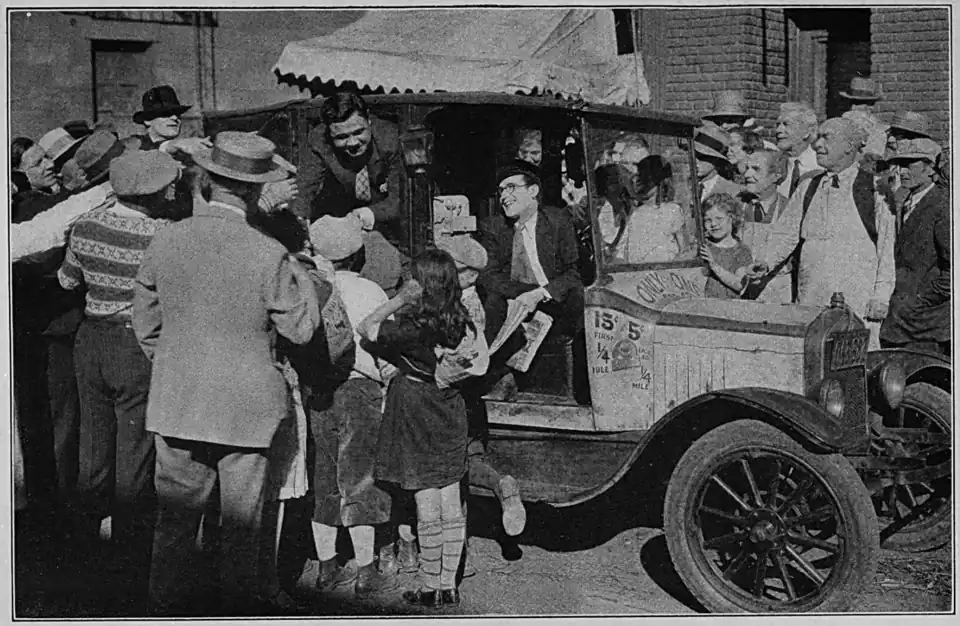Speedy climbed into the seat and grasped the wheel. The car was one of Moore's more ancient models. Speedy pressed the starter. The car burst into action with a terrific roaring of its motor and clouds of dark smoke.