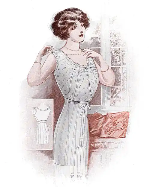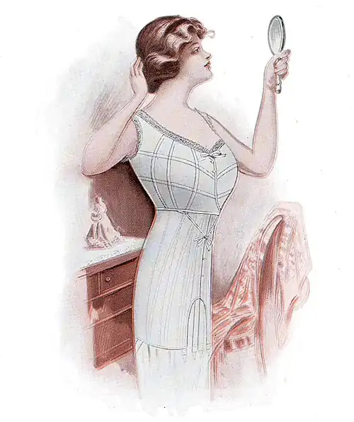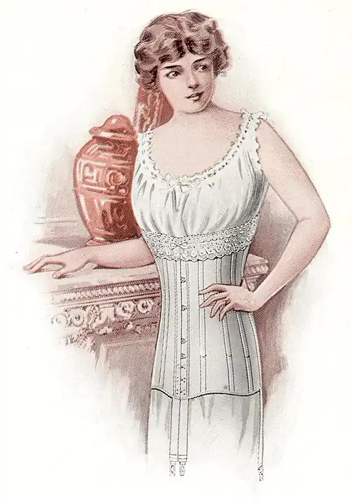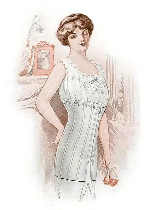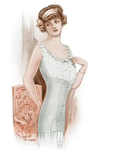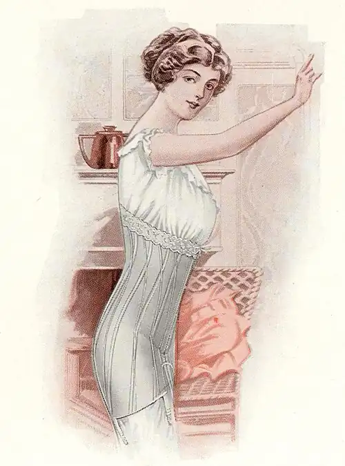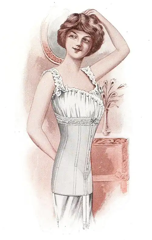 ¶ Made of light, strong, white batiste, daintily trimmed. Stiffened with the guaranteed Spirella sufficiently strong to withstand pressure of clothing. Adjustable at the waist by means of surplice and tapes which tie in front, a special tape loop obviating passing the tapes around the waist. Adjusts around the top of the garment by a draw tape in the lace. Can be easily laundered.