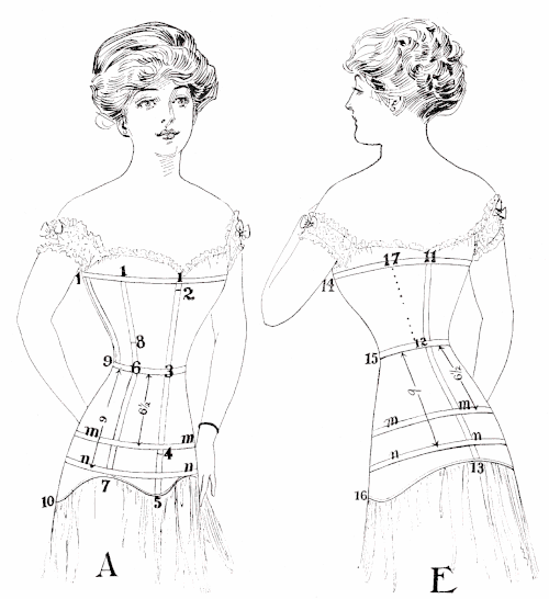 ¶ (7). Back above waist, indicated by dotted line 12-17 on diagram "E" is distance in inches desired from waist line to top of corset, measured from waist line up over shoulder blade, about 1½ inches from center of the back.