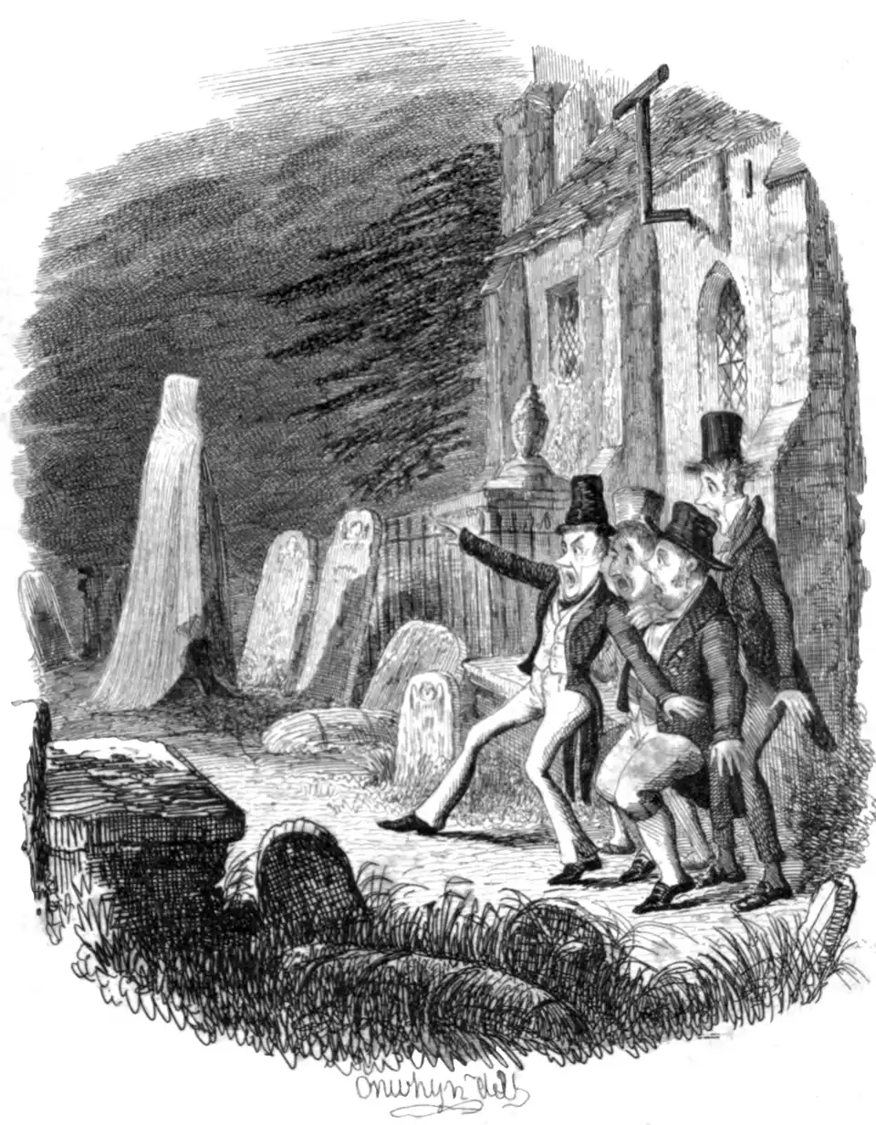 At this moment the figure—which, during the whole of the time, had been moving slowly from tomb to tomb—came towards them; but, as it advanced, they simultaneously receded, and continued to recede, looking constantly behind them, until they reached the gate, which they had no sooner passed, than, making themselves up for one grand effort, they darted towards the Crumpet and Crown with all the energy at their command.