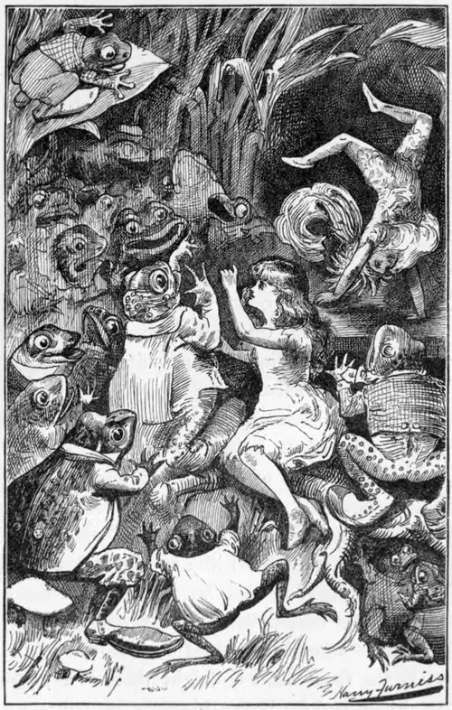 However, the chorus of guessing was cut short by Bruno, who suddenly rushed on from behind the scenes, and took a flying leap down among the Frogs, to re-arrange them.