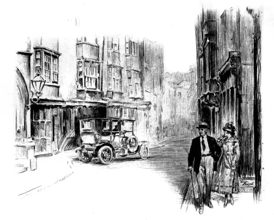 HIS daughter heard these words with a sinking heart. She had a most unhappy picture of herself boarding a ship and sailing out of Liverpool or Southampton, leaving the mystery that so engrossed her thoughts forever unsolved. Wisely she diverted her father's thoughts toward the question of food. She had heard, she said, that Simpson's, in the Strand, was an excellent place to dine. They would go there, and walk. She suggested a short detour that would carry them through Adelphi Terrace. It seemed she had always wanted to see Adelphi Terrace.