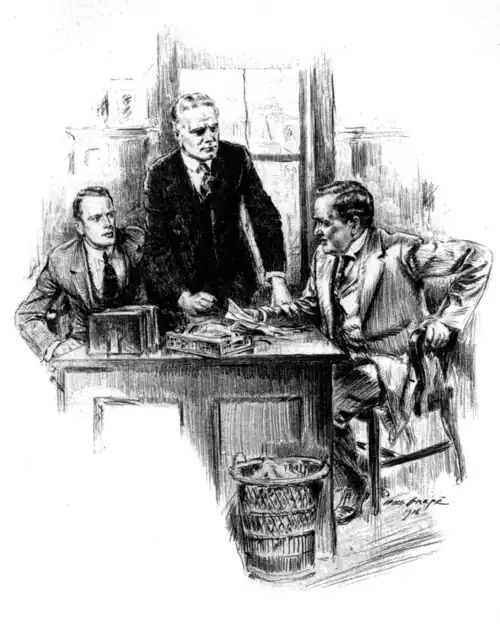 - “Captain Fraser-Freer and Von der Herts were completely unknown to each other. The mails were barred as a means of communication; but Fraser-Freer knew that in some way word from the master would reach him, and he had had a tip to watch the personal column of the Daily Mail. Now we have the explanation of those four odd messages. From that column the man from Rangoon learned that he was to wear a white aster in his button-hole, a scarab pin in his tie, a Homburg hat on his head, and meet Von der Herts at Ye Old Gambrinus Restaurant in Regent Street, last Thursday night at ten o'clock. As we know, he made all arrangements to comply with those directions. He made other arrangements as well. Since it was out of the question for him to come to Scotland Yard, by skillful maneuvering he managed to interview an inspector of police at the Hotel Cecil. It was agreed that on Thursday night Von der Herts would be placed under arrest the moment he made himself known to the captain.”