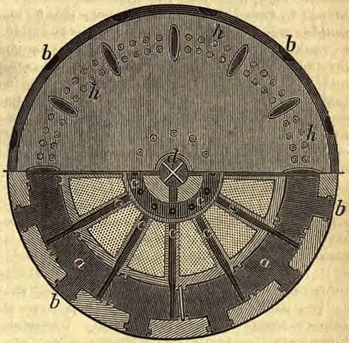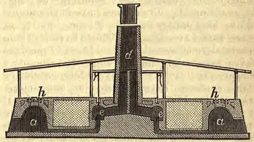 —The annular furnace for burning brick, invented by Friedrich Hoffmann of Berlin, is extensively used in Europe, and is said to possess great efficiency and economy. The following description and illustration are taken from Dr. Barnard's report of the Paris exposition of 1867. A large annular chamber, with openings at the sides for the reception of the bricks, is constructed with a central chimney, and with removable divisions for separating the annulus into different parts. When the furnace is filled with unburnt bricks heat is applied to one division, the smoke and hot air escaping into the adjoining one, which is the next to be burnt, the air for maintaining the combustion being received through the compartment last burned, whereby the bricks in it are cooled. Each compartment of bricks or other articles is thus burned in turn, the waste heat of the burning compartment continually drying the compartment before it, and taking all the heat of the one behind. The letters a a, fig. 1, mark the circular arched furnace, furnished with doors, b b. Flues, c c, lead to the circular chamber e e, surrounding the chimney, d. Valves of cast iron are made to close at pleasure the orifices of the flues. Movable sluices in the dividing walls allow of communication to be made or closed between the chambers; h h are plugs through which the coal, in powder, is introduced, undergoing calcination. The advantages of this furnace lie in its great economy of fuel. The heat is very equable, and no smoke is generated, the fuel being burnt while falling to the bottom of the furnace.—The immense consumption of bricks in cities has made it an important object to reduce the labor employed in their manufacture as much as possible, and consequently much ingenuity has been expended in devising machinery for grinding and moulding the clay. A great number of machines have been patented in this country and in Europe, but it has been found exceedingly difficult to render them practically successful. Two kinds of machines have been made, one by which it is sought to prepare the brick from clay which contains so little moisture that they may be immediately taken to the kiln, and another which moulds it in so soft a state that it requires to be dried before baking. The difficulty with the first method is that the bricks do not seem to possess the strength of those which are made of moister clay, and from the immense power required to press them to the proper size in the moulds some parts of the machinery are liable to break. Those machines which employ moist clay have been utilized in manufacturing pipe and tile and peculiar forms of brick; but in making common brick the saving of labor has not been found sufficient to make them take the place of hand labor, by which process nearly all the bricks used in building are made.—The red color of bricks is owing to the peroxidation of the iron contained in the clay. If the iron is deficient or only partially oxidized through insufficient heat, the bricks are of a pale color. The clay in the vicinity of Milwaukee, Wisconsin, is remarkably free from iron, and the bricks made of it are of a delicate straw color. Other colors may be imparted to brick, provided that of the oxide of iron does not overpower all other coloring matters introduced. American bricks vary in size in the different states, running from 7¾ to 8⅓ inches in length, 4 to 4½ in width, and from 2¼ to 2½ in thickness. The weight is commonly reckoned at 4 lbs. to the brick; but this varies with the size, the amount of pressure to which the clay has been subjected, and the heat applied in baking. English bricks are commonly 9 inches long, 4½ wide, and 2½ thick.—Floating Bricks. A very light silicious earth is occasionally met with, of which bricks have been made that float upon the water. Clay may be added to the silica, if required to bind the material together. Such bricks were made in ancient times, and were described by Posidonius and Strabo, and particularly commended by Vitruvius, Pollio, and Pliny. In 1791 they were again brought into notice by Giovanni Fabroni in Tuscany, who after many trials succeeded in making bricks which would float upon water. Their strength was but little inferior to that of ordinary bricks. They are remarkable not only for extreme lightness, but also for their infusibility, and for being very poor conductors of heat. They may be held by one end while the other is red-hot. As an experiment Fabroni constructed the powder magazine of a wooden ship with these bricks. The vessel, being set on fire, sank without explosion of the powder. In 1832 Count de Nantes and Fournet, a mining engineer, used them in constructing powder magazines and other parts of ships, lessening danger from fire. Kützing found the material from which these bricks were made to contain immense numbers of microscopic silicious shells of infusoria. Similar earth has been discovered in France and at Berlin, and it is probably the same whitish substance that is often found under our peat bogs.—Fire Brick. When bricks are required to withstand high temperatures, they are made of the most infusible clays, such as contain from 63 to 80 per cent. of silica, with from 18 to 25 per cent. of alumina, and the remainder water. Oxide of iron may be present, but the light color of fire brick shows that this is in very small quantity. Lime would render the mixture fusible, and this is necessarily always absent. Such clays are of common occurrence in the bituminous coal measures, where they are found making the floor or underlying stratum of the coal beds. The material is indurated, so that it is broken up like a soft stone. When used, it is ground in a mill, and mixed with fragments of previously baked fire brick, or of some refractory stone, or with a coarse, clean silicious sand and gravel. The materials are made into a paste with water, moulded in hand moulds, and baked in permanent kilns at a very high temperature. 