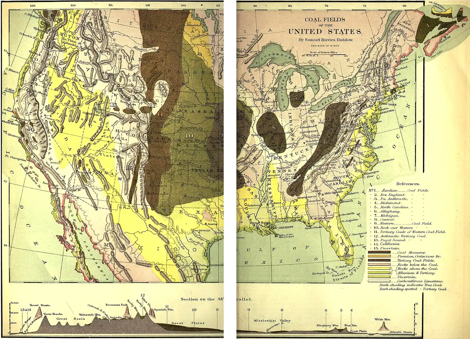 The area of the New Brunswick coal field is very large, but there is only one thin coal bed, too small to work. Nova Scotia produced 411,541 tons of coal in 1873, and Cape Breton island 639,926. The coal is all bituminous and of a fair quality for gas and steam purposes. There is also an unproductive anthracite coal field in Rhode Island and Massachusetts.—The foregoing fields comprise all the carboniferous coal in North America, and it is not probable that any other districts of any extent containing true coal will hereafter be discovered. Near Richmond, Va., is a very deep coal basin of the triassic age, which was the first worked in the eastern states, and after a long suspension work has lately been resumed. There are two other similar small basins in North Carolina, on Deep and Dan rivers, but neither of them is wrought.—Besides the foregoing carboniferous and triassic coal fields, there is in the N. W. part of this continent a very large area of coal fields which should be described with some detail. The coal or the combustible matter of these western basins is of the kind generally called lignite, of an inferior quality and of a more recent age, the tertiary. It has however the same appearance, and is by its chemical composition true coal; and its distribution in extensive basins along the eastern base of the Rocky mountains, bordering immense treeless plains where no other combustible of any kind can be found, gives to these coal fields an immense value. Indeed, in regard to the population of the gold-mining countries of the Rocky mountains, and to the building of railroads across the plains from the Missouri to the Pacific, the lignitic basin of the west is for the future as important as are for the present the Appalachian coal beds or the coal fields east of the Mississippi river. Along the Missouri river and west of it, the true carboniferous formations sink and disappear under the Permian. The line of the 96th parallel of longitude, from the point where it enters the state of Iowa to the southern limits of Kansas, shows nearly exactly the limits of the old coal fields. Further west the Permian, following a gradual westward dip, is overlaid by the cretaceous formations, which reach a thickness of 2,500 ft. or more; and over these, nearer to the mountains, the tertiary measures appear with their numerous and as yet scarcely explored beds of lignitic coal. By the upheaval of the Rocky mountains, the lower tertiary has been thrown up, sometimes to the perpendicular all along the base of the mountains, and there the capacity of some of its beds of coal has been exposed and is already utilized by workings on a comparatively large scale. The whole lignitic basin may be, like the coal fields of the east, subdivided into different basins, not by any positively marked difference in the nature and composition of the lignitic coal or by any difference whatever in the formation of their coal beds, but merely by geographical limitation, as follows: 1. The New Mexico lignitic basin. It is especially of great extent and rich in coal beds along the Rio Grande, on both sides of it, S. of Santa Fé and Albuquerque as far down as Fort Craig, the supply of fuel for the fort being obtained from a bed of lignite 5½ ft. thick, 5 m. E. of Don Pedro. A number of other valuable beds have been reported near San Felipe, and still more abundantly northward, around Santa Fé and up to the Eaton mountains. The coal of Placiere mountain, which is partly anthracite, is 5 to 6 ft. thick. The following section, taken at the foot of the Raton mountains, shows the average distribution of the lignitic formations of this southern basin: