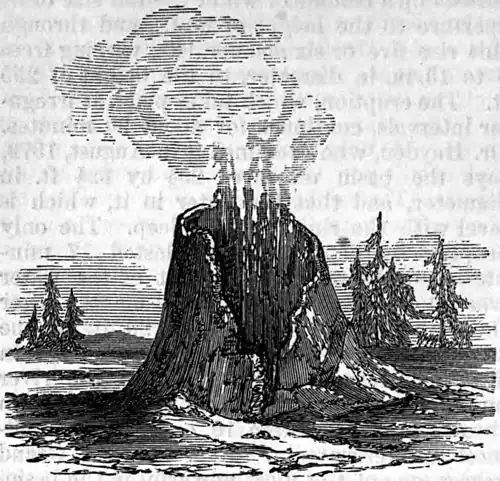 Another is named the Thud geyser, from the dull suppressed sound given off as the water rises and recedes. It has a beautiful scalloped rim, with small basins around it. This group of geysers is said to resemble a factory village, the steam rising in jets from more than 100 orifices. The third group lies three fourths of a mile S. E. of the second, at the base of a spur of the mountains, and extending up a ravine about 1,000 yards. They cover a space 500 yards in width. The temperature of 20 springs ranged from 130° to 196°. Near the centre of the group is a small lake, 600 ft. long by 150 wide, on the E. shore of which is a geyser spouting to the height of from 15 to 20 ft. There are three sulphur springs here, the only ones in the region, and S. E. of the lake is an iron spring. About 1,000 yards further S. is the fourth group, in a ravine about 1½ m. long and 300 yards wide. It contains many springs and geysers, the temperature of 42 of which ranged from 112° to 198°, the temperature of the air being about 60°. The principal geyser is at the mouth of the ravine. Its basin is circular and about 60 ft. in diameter, and its spring, in the centre, from 15 to 20 ft. The water is blue, and is constantly agitated. When in eruption the column is projected 100 ft. high, and is accompanied by immense clouds of steam. Near the upper end of the ravine is a spring around which the deposit is black, instead of the usual white. The fifth group, on the banks of the Fire-Hole river, is the largest of all, covering nearly a square mile and comprising a great number of springs and geysers. The temperature of 95 examined ranged from 112° to 196°, the air at the time being 70°. None of them are of much importance. One, from its resemblance to a shell, is named the Conch spring; its basin is triangular, from 8 to 10 ft. in diameter. A little below it, on the bank of the river, there is a fine geyser, with a crater 3 ft. high. The Horn geyser has a crater like a horn, about a foot in diameter at the top and 6 ft. at the base; it is in constant ebullition. The Bath spring has a square basin 30 ft. across, of unknown depth. The Cavern has a basin 15 by 20 ft. wide and 20 ft. in depth; the water is of a bright blue tint, and of wonderful clearness. The mud springs of this group are from an inch or two to 20 or 30 ft. in diameter, their contents varying from turbid water to stiff mud. They are in a constant state of agitation. The mud is of different colors, being pure white in some, in others brown, black, or blue. The sixth group is 2 m. S. W., on a small stream flowing into the Fire-Hole. They are in an open, prairie-like valley, for the most part marshy. The temperature of 34 of the springs varied from 106° to 198°. One of them is strongly chalybeate. The seventh group is on the Fire-Hole river, about 2½ m. S. of the preceding. The temperature of 20 of the springs ranged from 132° to 196°, when the air was from 70° to 76°. The largest has a basin over 400 ft. in diameter. Below it is another huge spring, named the Caldron, the view of which is almost obscured by the dense clouds of steam rising from it. The upper geyser basin lies in the valley of the same river, about 8 m. S. of the lower basin. It is not so large as the latter, covering an area of only about 3 sq. m., and it contains fewer springs; but the phenomena exhibited are far more remarkable. Most of the springs and geysers are near the river, extending along on both banks about 3 m. The temperature of 106 of them ranged from 113° to 196°, the average being over 170°, the temperature of the air being 67°. At the head of the valley, at its southern extremity, stands Old Faithful, a geyser so called for its regularity; it spouts at intervals of about an hour, throwing a column of water 6 ft. in diameter to a maximum height of 130 ft., and holding it up by a succession of impulses from 4 to 6 minutes. The great mass of the water falls directly back into the basin, flowing over the edges and down the sides in streams. When the action ceases, the water recedes out of sight, and nothing but the occasional hiss of steam is heard until the time approaches for another eruption. Its crater is a conical mound of geyserite about 12 ft. high, measuring at the base 145 by 215 ft. and at the top 54 by 20 ft. Near it are four extinct geyser cones. On the opposite side of the river are the Beehive and the Giantess. The former is a silicious cone 3 ft. in height, 20 ft. in circumference at the base, and 3 by 4 ft. in diameter at the top, with an oval orifice 3 by 2 ft. in diameter. When in action, which occurs once in about 24 hours, it throws a column of water entirely filling the crater to a height which, says Langford, was found by triangular measurement to be 219 ft. The eruption lasted 18 minutes, and the stream did not deflect more than 4° or 5° from a vertical line. Dr. Hayden witnessed three eruptions, which lasted from 4½ to 15 minutes; he measured the height of but one, which was over 100 ft. He describes the column as fan-shaped, and says that no water falls from it, but it is resolved into spray which appears to evaporate as soon as formed.