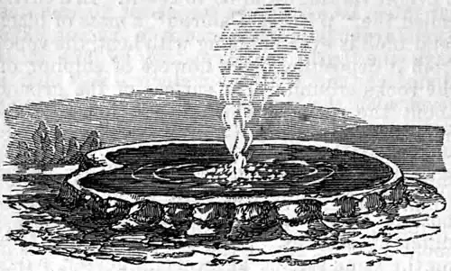 The Giant geyser has a rugged crater, like a broken horn, 10 ft. in height and 24 by 25 ft. at the base. The top is about 8 ft. in diameter, with an irregular orifice of 5 or 6 ft. in width. The cone is open on one side, having a ragged aperture from the ground upward. Its discharges are irregular, and continue for irregular periods. When Prof. Hayden saw it in 1871, it played an hour and 20 minutes, throwing the water 140 ft.; but Lieut. Doane, who visited it the year before, states that it played 3½ hours at one time, to a height varying from 90 to 200 ft. The Grotto, the Punch Bowl, the Riverside, the Soda, and the Fan geysers, and numerous others which have not yet even been named, merit notice. There are wonderful groups also on the S. W. side of Shoshone lake, the head of one of the principal forks of the Shoshone or Snake river; and on Gardiner's river are some of the most remarkable springs in the world. The springs in action among the latter are not so numerous nor so powerful as those of the Fire-Hole basin, but are far more wonderful in their calcareous deposits, which exceed even those of the New Zealand geysers. In one place a hill 200 ft. high has been formed in a system of terraces, ornamented with semicircular basins, and with beadwork of beautiful colors on a snow-white ground. These calcareous deposits cover an area of about two miles square. The active springs extend from the margin of the river to an elevation of 1,000 ft. above, the highest being 6,522 ft. above the sea. The geysers of the Fire-Hole basin are from 6,800 to 7,000 ft. above the sea. The valley of the Madison, with its branches, is shut in by high volcanic mountains, gashed with deep gorges, strewn upon their sides and at their bases with fragments of trachyte and obsidian, and covered with tall pines. Between the sources of the Madison and the Yellowstone these mountains rise to 9,000 or 10,000 ft. above the sea. The valley of the Fire-Hole river is covered with the silicious deposits of the springs, and resembles an alkali flat. The bed of the stream is lined with white silica. Beneath this formation are lake or local drift deposits, and still lower basalt. The surface deposit is chiefly geyserite. The most of it is of an opaque white color, but in the lower basin pink specimens are found which are translucent. Some of it is greenish gray and some pearly, like enamel; and it assumes forms similar to those in Iceland. Some have a cauliflower-like form, and break very easily; others are beaded, and others covered with small stalagmitic processes. The texture varies from porous to compact, the most being porous and arranged in layers. The geyser cones are generally compact, and often have an enamel-like coating. A specimen of the white geyserite, of cauliflower form, contained silica 83.83, water 11.02, chloride of magnesium 4; total, 98.85. The water contains very little solid matter. A specimen brought back by Dr. Peale was as clear as when bottled at the springs, showing no deposit; it contained 83525⁄85 milligrammes of solid matter to the litre, consisting mainly of silica; chloride of lime and sulphate of magnesia were present in small quantity, and there was a slight trace of iron.—The geysers of Iceland are treated of in “Letters on Iceland,” by Von Troil (1772); “Travels in Iceland,” by Sir George Mackenzie (1810); “Journal of a Residence in Iceland during the years 1814 and 1815,” by Ebenezer Henderson; “Visit to Iceland in the Summer of 1834,” by John Barrow, jr.; “A Visit to Iceland,” by the Hon. A. Dillon (1840); observations of M. Descloiseaux in Annales de chimie et de physique (April, 1847), and “Philosophical Magazine” (vol. xxx. p. 397); “Tracings of Iceland and the Faroe Islands,” by R. Chambers (1856); “A Yacht Voyage,” by Lord Dufferin (London, 1858); “Iceland, its Scenes and Sagas,” by Sabine Baring-Gould (1863); “The Land of Thor,” by J. Ross Browne (1867); and “A Summer in Iceland,” by C. W. Paijkull, translated from the Swedish by the Rev. M. R. Barnard (1868). For an account of the New Zealand geysers see Neu-Seeland, by Ferdinand von Hochstetter (Stuttgart, 1863). For geysers in the United States, see report of Lieut. G. C. Doane (1871), and the fifth and sixth annual reports of the “United States Geological Survey of the Territories,” by F. V. Hayden (1872 and 1873).
