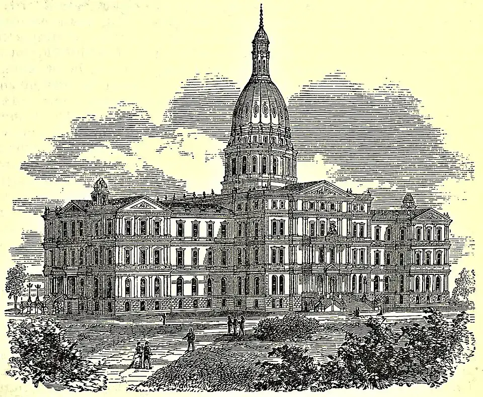 The state reform school occupies a farm of 139 acres in the E. part of the city, and has about 200 inmates. It has four brick buildings, the central one being 48 ft. long, 56 ft. deep, and four stories high, with two wings extending north and south, each 95 ft. long, 33 ft. deep, and three stories high, and a third extending east, 83 ft. long, 30 ft. deep, and three stories high. The state agricultural college occupies a farm of 676 acres, 3 m. E. of the city limits. The buildings, four in number, stand upon a slight eminence amid forest trees; the grounds immediately around have been handsomely laid out. It was chartered in New State Capitol at Lansing, Michigan. 1855, and subsequently received the congressional land grant to the state for an agricultural college. The number of students in 1873 was 143. The odd fellows' institute, for the care and education of orphans of the order, in the N. W. extremity of the city, was organized in 1871. It occupies a tract of 45 acres and a brick building (since enlarged) formerly used as a female college, and has a library of 1,500 volumes. At the mouth of Cedar river in the southern portion of the city is an artesian well, yielding mineral water of medicinal properties. Lansing is well supplied with railroads, four lines centring here, viz.: the Jackson, Lansing, and Saginaw; Detroit, Lansing, and Lake Michigan; Peninsular; and Lake Shore and Michigan Southern. It is surrounded by a fertile country, abounding in timber and coal, and has an important and increasing trade. The river affords water power, which has as yet been but little utilized. The principal manufactories are three of sash, doors, and blinds, two of chairs, one of spokes, felloes, and bent work, two of barrels, three of iron work, including agricultural implements, sewing machines, and steam engines, several saw mills, a flouring mill, and a woollen mill. There are two national banks with a capital of $175,000, and an insurance company with $100,000 capital. The public schools are graded, including a high school department, and in 1873 had 27 teachers and 1,050 pupils. The Michigan homœopathic college, open to both sexes, is situated here. The state library has more than 20,000 volumes, the public school library about 500, and that of the Lansing library and literary association about 1,000. Two weekly newspapers are published, and there are 15 churches, viz.: Baptist, Congregational, Episcopal, Freewill Baptist, Lutheran, German Evangelical Lutheran, Methodist (5), Presbyterian (2), Roman Catholic, and Universalist.—Lansing was made the seat of government in 1847, when its settlement was barely begun, and was incorporated as a city in 1859.