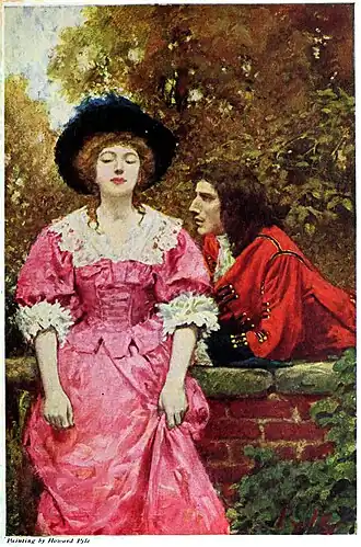 Walking so, slowly, she came to the confines of the park; here an old and sunken wall of brick divided it from open meadow-land that dipped slowly to the hollow where the village lay. The sun glittered on the distant vane on the church spire and shone golden in broad fields of grain and rich orchards. Sophie, with no regard to this slumbrous prospect before her, climbed the low wall and descended the slope of grass beyond. At the bottom of this slope a little wood was to be entered by a path crossed by a wooden stile; leaning against this stile a man in faded vermilion velvet stood in a very intent attitude, absolutely motionless, his head turned from Sophie's advance. She, as soon as she saw him, slackened her pace, and paused altogether at length to gaze at him in a slow, half-resentful manner.