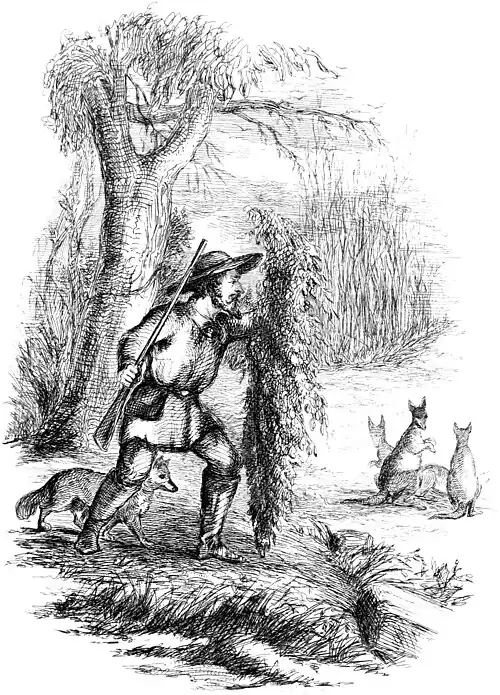 As animal food formed no part of their stores, and the rain ceasing, it was considered advisable to try the neighbourhood for a kangaroo or wallaby before finally bidding adieu to the plains. The intelligent Lady appeared to be quite aware of the necessity of providing for the future, and she was most obedient to her master's commands. Very suddenly Dodge came to a halt, and calling her to his side, desired his friends to look at the picture before them. It was some minutes before they espied several kangaroos feeding quietly in an open space about two hundred yards distant. Giving directions to his friends to conceal themselves in the grass, Dodge retreated, still watching every movement of the animals, until he reached a neighbouring tree. Plucking some small branches which he arranged so as to form a screen, easily carried before him with one hand, he advanced upon his prey, in a direction favourable for the accomplishment of his purpose, and had nearly reached within gunshot, when a slight shifting of the breeze warned the sensitive animals of approaching danger: they ceased to feed, and appeared uneasy and watchful.[1] These signs were not lost upon the wary old bushman, who remained stationary for some minutes, when a further variation of the wind came kindly to his aid, and he again advanced. As soon as he had reached within gun-shot, he dropped the screen of leaves, and the next moment the report of his gun was heard echoing amongst the neighbouring hills. The result of the shot was soon manifest, for a large old man kangaroo, badly wounded, was seen struggling with Dodge and his dog; the latter had fixed her teeth in her adversary's neck, whilst her master had seized its tail, and both were being dragged and jerked about in a most unceremonious manner, without much opportunity of making any resistance. The two friends reaching the scene of action, soon changed the aspect of affairs, and increased the prospect of a substantial meal. The kangaroo, confused amongst its numerous foes, before long afforded an opportunity which Dodge quickly embraced. Drawing his knife, with one sweep of his arm he separated the ham-strings of his antagonist, and laid him powerless at his feet; once there, he was soon dispatched, and a quarter of an hour sufficed for cutting him up, and each man bore off a share of the booty.