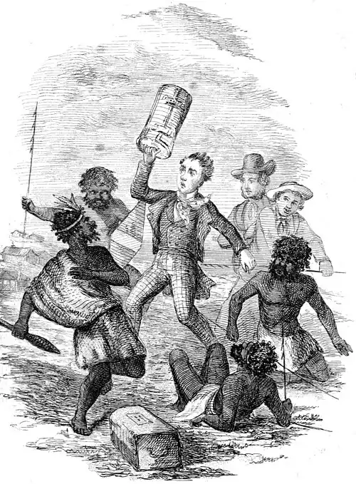 Whilst Mr. Weevel was bemoaning his forlorn and helpless condition, a figure emerged from the scrub attired in the faded uniform of a Captain of Marines, its head covered with a hat marvellously like Mr. Weevel's. As it approached nearer, it was discovered to be Benbo the native, who, having been presented by some military colonist with the red rags, always took the earliest opportunity of appearing in them before strangers. He approached with a majestic step, as if treading on the necks of emperors, and taking the hat from his head, which was literally plastered with fat and ornamented with kangaroos' teeth tied to the hair in little bunches, placed it respectfully upon that of its owner, and then, by way of fitting it properly, subjected him to the process known in England as "bonneting." — "Berry good hat," he said,—"black fellow only look—not teal." Weevel stood transfixed, whilst Hugh and Slinger were convulsed with laughter.