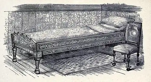 The other, of modern carved oak, had been copied from the pattern of an old settle. It was low and wide, with only one deep well-stuffed mattress, round which an Algerine striped blue and white cotton cloth had been wrapped. Of course this could be removed at night, and the bed made up in the usual way. It struck me, with its low, strong railing round three sides, as peculiarly suitable for a change of couch for a sick child, though it could hardly be used by a full-grown person as a bed.