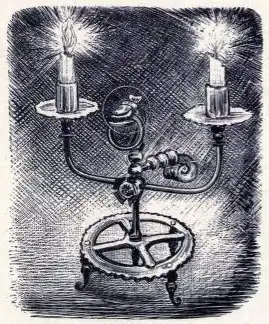 Before the subject of fire is laid aside, we must just touch upon candles and lamps. Fig. 13 is a simple and ordinary form of candlestick, which would be safe enough from risk of fire if these sheltering shades were made, as they often are, of tin, painted green, and then there would be no danger if it stood on a steady table, by the side of even the sleepiest student. But perhaps this design (Fig. 15) is the most uncommon, though it would not be safe to put so unprotected a light except in a perfectly safe draughtless place. However, there is also in this branch of decorative art a great variety of beautiful models to choose from. Antique lamps, copied from those exquisite shapes which seem to have been preserved for us in lava and ashes during all these centuries, with their scissors and pin and extinguisher, dangling from slender chains, lamps where modern invention for oil and wick meet and blend with chaste forms and lines borrowed from the old designers, and where the good of the eyesight is as much considered as the pleasure to the eye itself.