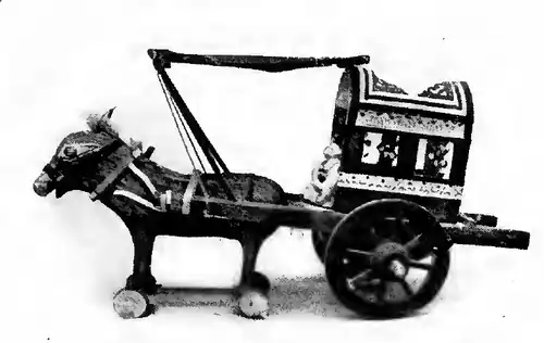 The toy carts are made of tin, wood and clay. Some of them are very simple, having paper covers, while others possess the whole paraphernalia of the street carts. When the mule of the toy cart is unhitched and unharnessed, he looks like a very respectable mule. Nevertheless, instead of devouring food, he becomes the prey of insects. Usually he appears the second season, if he lasts that long, bereft of mane and tail, as well as a large portion of his skin.