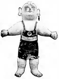 He had a number of others both large and small with papier maché heads, leather bodies, and clay arms and legs. The body was like a bellows in which a reed whistle was placed, that enabled the baby to cry in the same tone as the toy dog barks or the cock crows. They had "real hair" in spots on their head similar to those on the child, and they were dressed in the same kind of clothing as that used on the baby in summer-time, viz., a chest-protector and a pair of shoes or trousers.