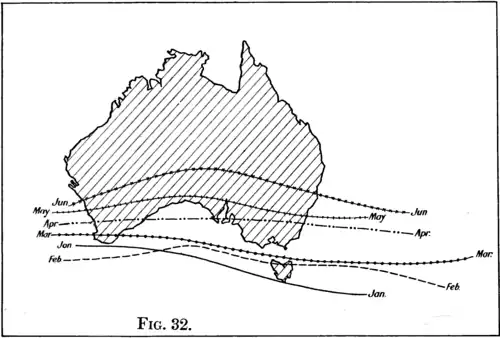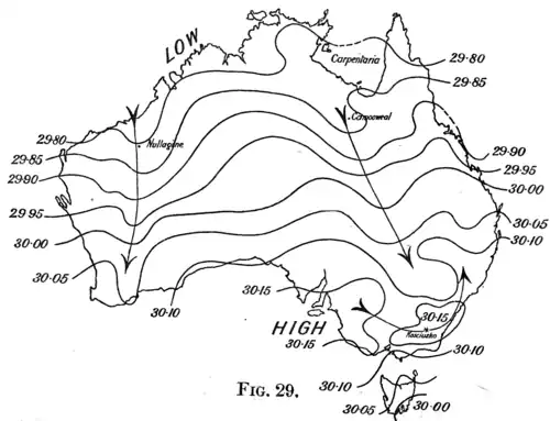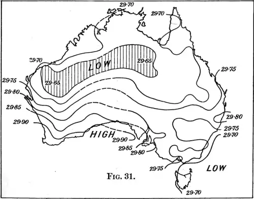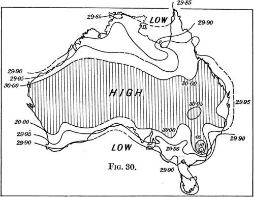 During winter, in May, June, July, and August, there is a well-marked area of high pressure centreing in the Western Plains of New South Wales, with the axis running approximately from Brisbane to Perth. The low-pressure isobars of 29.90 run parallel to this direction, through Port Darwin, in the north, and through Tasmania, in the south.