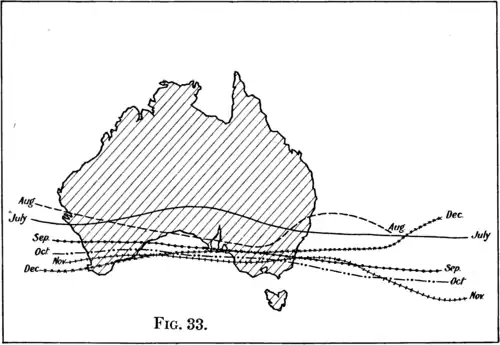 In November the summer conditions began to recur, a low-pressure area (29.7) forming over the Pilbara area, and the Carpentaria loop running down into Queensland. The highest pressures were now on the New South Wales Coast, being pushed seawards as the highlands warmed under the southern sun. The monsoonal condition of Australia was very strikingly shown n the isobars of December, 1910, when the hot region (from the Pearling Coast to Camooweal, Queensland) was occupied by a belt of low pressure (29.65) around which isobars were arranged, the highest pressures being along the south-west coast from Leeuwin to Eucla.