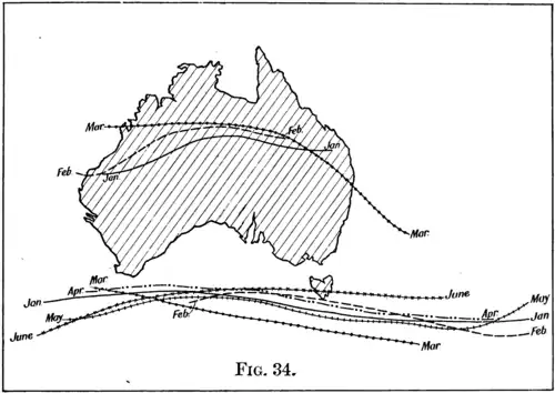 The general tracks of the disturbances are shown on the diagrams, Figs. 32—35 (for 1910), when three facts may be noted in their characteristics. The tropical belt is much more irregular, the paths being often recurved. This series is never well developed in winter, the months of April, May, June, July, and August being generally free from these disturbances.