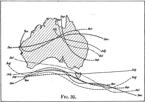 This table shows (as might be expected) that the anticyclones are most numerous in winter (July and August), and least numerous in midsummer. The tropical depressions are generally unimportant in winter (May, June, July, and August), and increase in number as the sun moves south to a position over the continent. The Antarctic disturbances are somewhat less in evidence at Midsummer. At this period the southern low-pressure belt has moved southward and its accompanying eddies (the Antarctic V's or ows) do not so often influence Australian weather.