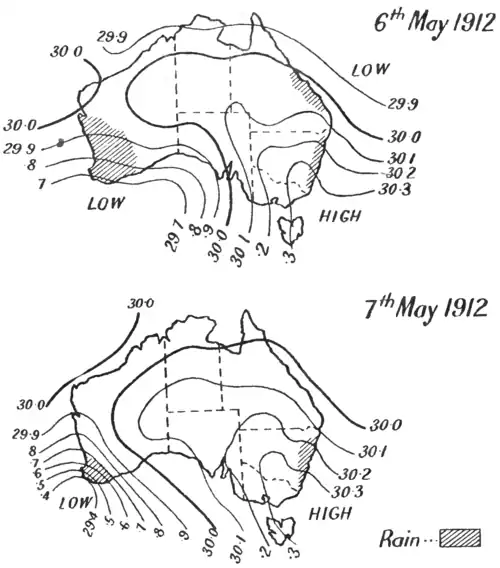 - ↑ Note.—The normals for Queensland stations refer to 9 a.m. observations only; the others are the means of the 9 a.m. and 3 p.m. observations.
