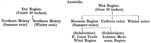 Our study of the chief weather elements has shown us that Australia has not one general climate, but contains within its vast area several types of climate. They may be classified according to many factors; such as amounts of rainfall, seasons of rainfall dominant winds, topography, &c., &c. A combination of the first two criteria seems to furnish the best primary division, while the less important factors will determine the secondary subdivision.