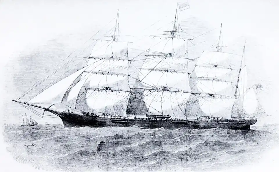 The Great Republic sailed on her first voyage, February 21, 1855, commanded by Captain Limeburner, and made the run from Sandy Hook to Land's End in thirteen days. On her arrival at London, three days later, she was obliged to lie in the Thames, as no dock was large enough to take her. She was subsequently chartered by the French Government as a troop ship during the Crimean War, and carried 1600 British soldiers from Liverpool to Marseilles. During the Civil War, she was chartered by the United States Government as a troop ship, and was one of the transports in Butler's expedition to Ship Island.