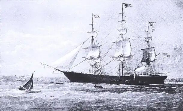 The Australian, an iron screw steamer of 2000 tons, was the first steamship to carry the mails from England to Melbourne. She sailed from Plymouth, June 5, 1852, and called at St. Vincent, St. Helena, Table Bay, and St. George's Sound for coal, which had been sent out by ship from England to meet her. She arrived at Melbourne in 89 days from Plymouth, and returned by the Cape of Good Hope in 76 days. She arrived at London, January 11, 1853, having been 7 months and 6 days upon the voyage, a creditable but not a very brilliant performance. The Australian was soon followed by the Great Britain, Adelaide, Queen of the South, Sydney, Cleopatra, Antelope, and other iron screw steamers; but these vessels nearly ruined
