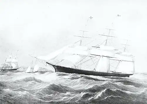 The White Squall was another handsome clipper, very similar in construction and design to the Samuel Russell and Oriental from the same yard. Although but little more than eleven hundred tons register, this ship cost when ready for sea with one year's stores and provisions on board the sum of $90,000, and her freight from New York to San Francisco on her first voyage amounted to $70,000. She was commanded by Captain Lockwood, and her measurements were: length 190 feet, breadth 35 feet 6 inches, and depth 21 feet.
