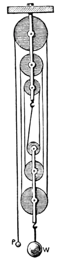 Let us begin with the second system of pulleys. Here we have a power P attached to the one end of a thread, which passes over all the pulleys, and is ultimately attached, by its other extremity, to a hook in the upper or fixed block. The weight W is, on the other hand, attached to the lower or moveable block, and rises with it. Let us suppose that the pulleys are without weight and the cords without friction, and that W is supported by six cords, as in the figure. Now, when there is equilibrium in this machine, it is well known that W will be equal to six times P; that is to say, a power of one kilogramme will, in such a machine, balance or support a weight of six kilogrammes. If P be increased a single grain more, it will overbalance W, and P will descend, while W will begin to rise. In such a case, after P has descended, say six metres, its weight being, say, one kilogramme, it has lost a quantity of energy of position equal to six units, since it is at a lower level by six metres than it was before. We have, in fact, expended upon our machine six units of energy. Now, what return have we received for this expenditure? Our return is clearly the rise of W, and mechanicians will tell us that in this case W will have risen one metre.