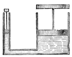 Here, then, we have a machine in virtue of which a pressure of ten kilogrammes on the small piston enables the large piston to rise with the force of 1000 kilogrammes. But it is very easy to see that, while the small piston falls one metre, the large one will only rise one centimetre. For the quantity of water under the pistons being always the same, if this be pushed down one metre in the narrow cylinder, it will only rise one centimetre in the wide one.