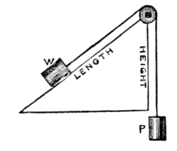 45. Or, again, let us take the inclined plane as represented in Fig. 3. Here we have a smooth plane and a weight held upon it by means of a power P, as in the figure. Now, if we overbalance P by a single grain, we shall bring the weight W from the bottom to the top of the plane. But when this has taken place, it is evident that P has fallen through a vertical distance equal to the length of the plane, while on the other hand W has only risen through a vertical distance equal to the height. Hence, in order that the principle of virtual velocities shall hold, we must have P multiplied into its fall equal to W multiplied into its rise, that is to say,