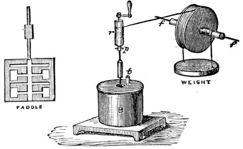59. For a precise determination of this important point, we are indebted to Dr. Joule, of Manchester, who has, perhaps, done more than any one else to put the science of energy upon a sure foundation. Dr. Joule made numerous experiments, with the view of arriving at the exact relation between mechanical energy and heat; that is to say, of determining the mechanical equivalent of heat. In some of the most important of these he took advantage of the friction of fluids.